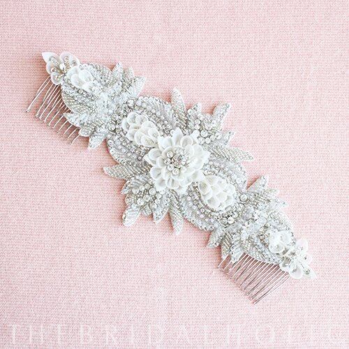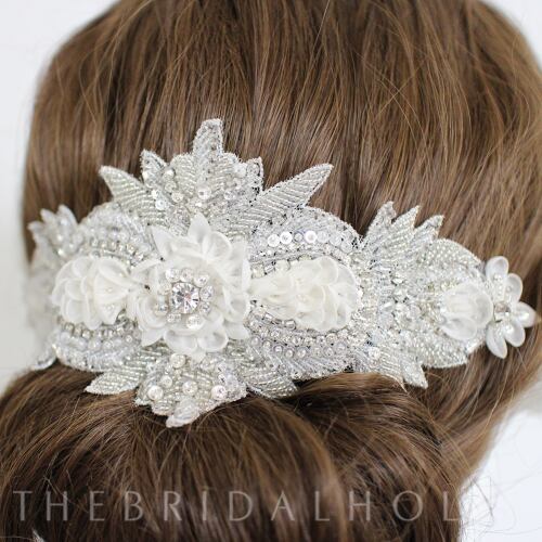 クリスタル、ビーズ、ファブリックを使った大きめのモチーフがオシャレなヘッドコームです。
