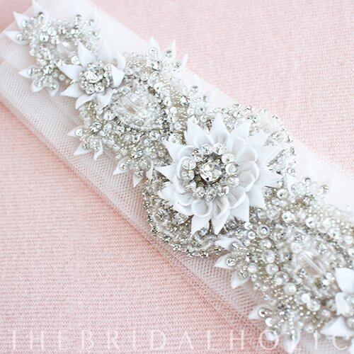 クリスタル、ビーズ、ファブリックをたくさん使ったモチーフが華やかなヘッドバンドです。